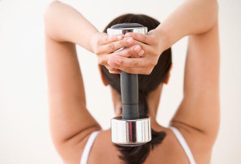 Stand with one foot slightly in front of the other, and hold a single dumbbell with both hands wrapped around the handle. Slowly raise the dumbbell overhead. Straighten your elbows as you raise the weight toward the ceiling. Slowly bend your elbows and lower the weight behind your head. Keep your upper arms still and vertical to the floor. Keep your shoulder blades down and back as you repeat.