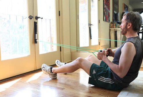 Get ready to learn 10 at-home exercises that work your major muscle groups. For each one, begin with one set where you do the move 8-15 times, or "reps." Rest for at least 30 seconds before you do the next exercise. Start with resistance bands or light dumbbells, so you can focus on lifting and lowering the weights with smooth, controlled movements. When you can do two or three sets easily, switch to slightly heavier weights.