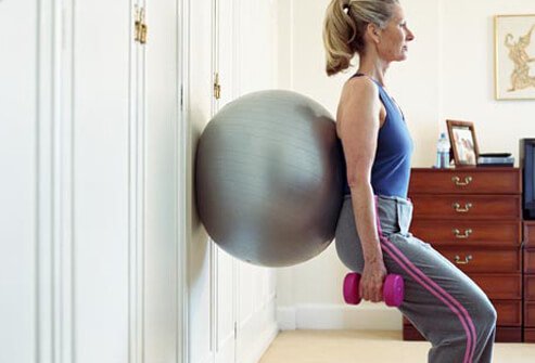 Stand with your feet shoulder-width apart. Bend your knees and lower yourself as if you were sitting in an imaginary chair. Your thighs should be parallel to the ground and your knees should not push forward past your toes. Lean forward slightly as you stand back up. You can also do squats while leaning against a stability ball placed between your back and a wall.