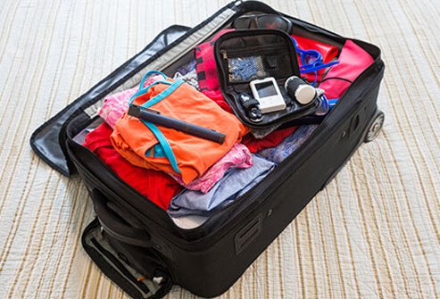 Bring two blood glucose monitors with you (pack each separately) and up to 2 weeks of extra supplies including insulin, test strips and lancets, glucose meter batteries, and insulin pump supplies. It may also be a good idea to carry rapid-acting insulin, even if you don't normally use it, to treat high blood glucose in a pinch. Be sure to bring appropriate shoes and check your feet daily for any signs of infection.